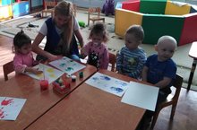 Сегодня воспитатели учили упражнять детей в печатанье ладошки на поверхности листа. «Крошки – осьминожки яркие ладошки» .Показали сходство очертаний осьминога с силуэтом перевернутой ладони. Поддерживали радостное настроение при создании художественного образа. Познакомили с приемами нетрадиционного рисования, расширяя знания о подводном мире.