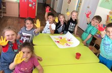 Вот и наступило долгожданное лето. Солнышко – одно из главных символов лета. Не смотря на первый месяц лета, солнышко не радует нас своим теплом. Поэтому мы с воспитанниками решили сделать солнышко, которое будет светить нам каждый день. В подготовительной к школе группе прошло тематическое занятие «Рада лету детвора, не уходит со двора», а также сделали творческие работы: нарисовали лучики с помощью ладошек. Теперь эти солнышки освещают детскую комнату.(Источник Ятокина Р.И.)