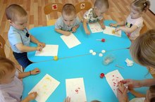 Воспитатель провела беседу о съедобных и ядовитых грибах. Ребята разгадывали загадки и рассматривали муляжи грибов. В результате продуктивной деятельности выросла целая поляна мухоморов и подберёзовиков.