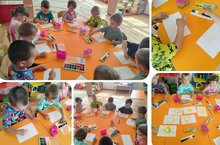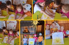 Отгадывая загадки, делая физминутку и используя нетрадиционные техники рисования(ладошки и трубочки для сока), воспитанники старшей группы изобразили веселый дождик и жаркое солнышко. -