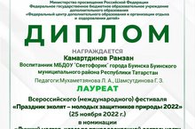 Воспитанник подготовительной к школе группы Камартдинов Рамзан стал лауреатом Всероссийского (международного) фестиваля"Праздник Эколят-молодых защитников природы 2022" в номинации "Лучший мастер - класс по природоохранной деятельности и экологическому просвещению". Поздравляем! Желаем дальнейших успехов! Руководители :Мухаметзянова Л. А., Шамсутдинова Г. З.