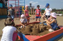 Для воспитанников подготовительной группы было организовано развлечение " Строим замки из песка". Ребята с удовольствием раскапывали ямки, насыпали холмики, рыли туннели, строили мостики, возводили крепости и украшали свои постройки.