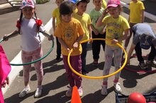 соревновались в разных эстафетах. Они гоняли клюшкой мяч, переносили предметы, прыгали, бегали. В ходе подготовки к эстафетам ребята придумали названия своим командам и девиз. «Быстрые» и «Ловкие» соревновались в ловкости, меткости, скорости. -
