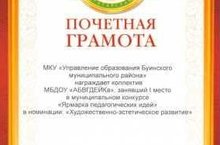 Воспитатели активно участвуют в различных профессиональных и творческих конкурсах, организованных МКУ "Управление образования Буинского муниципального района". коллектив МБДОУ "АБВГДЕЙКа" занял 1 место в муниципальном конкурсе "Ярмарка педагогических идей" в номинации "Художественно-эстетическое развитие."