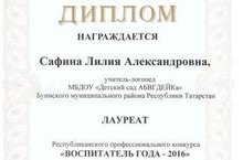Поздравляем Сафину Лилию Александровну, учителя-логопеда детского сада "АБВГДЕЙКа" с дипломом лауреата "Республиканского профессионального конкурса "Воспитатель года-2016"" . Желаем дальнейших творческих успехов!