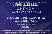 Учащаяся художественного отделения ДШИ - Зулхарова Альбина, преподаватель Каримова А.К., стала лауреатом Международного грантового конкурса искусств "Выше звезд" в номинации Изобразительное искусство, с работой "Горы".
