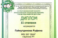 Гайнутдинова Руфина получила Диплом II степени в VII Республиканском конкурсе экологической социальной рекламы "Город под защитой детства", номинация "Компьютерный рисунок", руководитель Каримова А.К.