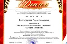 Преподавтель фортепиано Фахуртдинова Резеда Анваровна приняла участие и стала Лауреатом I степени в Республиканском конкурсе методических работ преподавателей музыкально-теоретических дисциплин ДМШ и ДШИ РТ "Созвездие Педагогических Идей". В номинации "Методическое сообщение" она выступила с темой "Реализация межпредметных связей (исполнительских и музыкальных теоретических дисциплин) - залог успеха обучения и воспитания обучающихся на уроках фортепиано".