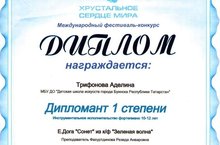 Учащаяся 5 класса музыкального отделения ДШИ Трифонова Аделина, руководитель Фахуртдинова Резеда Анваровна, приняла участие в данном фестивале и стала ДИПЛОМАНТОМ 1 степени. Поздравляем Аделину!