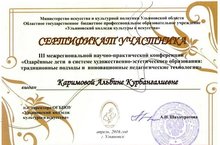 Преподаватели ДШИ Каримова А.К.,Фахуртдинова Р.А.,Кузьмина Л.А., Шайхутдинова Р.Х.,Тазетдинова Н.Н. приняли участие в III межрегиональной научно-практической конференции "Одаренные дети в системе художественно-эстетического образования: традиционные подходы и инновационные педагогические технологии". Конференция прошла в Ульяновском колледже культуры и искусства, преподаватели получили СЕРТИФИКАТЫ.