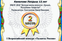 Камалова Ландыш - ученица преподавателя Тазетдиновой Н.Н. заняла 2 место в I Всероссийском конкурсе "ТАЛАНТЫ РОССИИ". В номинации "Музыкальный конкурс" Ландыш исполнила "Посвящение" - П.Чекалова. Поздравляем, желаем новых побед!