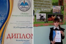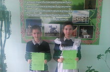 Участники конкурса «Грамотность на кончике пера» Хусаинова Гульчачак -11 класс и Халимова Диана- 5 класс. Занявшие первые места среди сельских школ (кустовой тур).