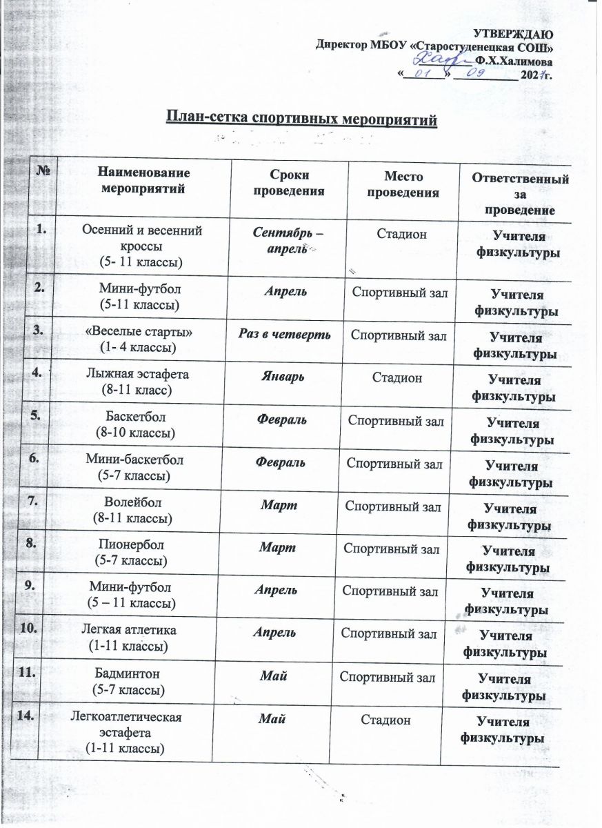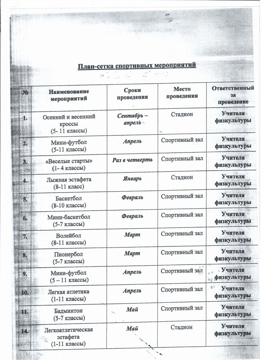 План-сетка спортивных мероприятий.
