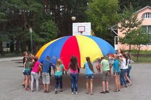 Җәйге лагерьда балалар вакытларын күңелле үткәрәләр. Саф һавада спорт мәйданчыгында уйнау аеруча сәламәтлеккә файдалы була.