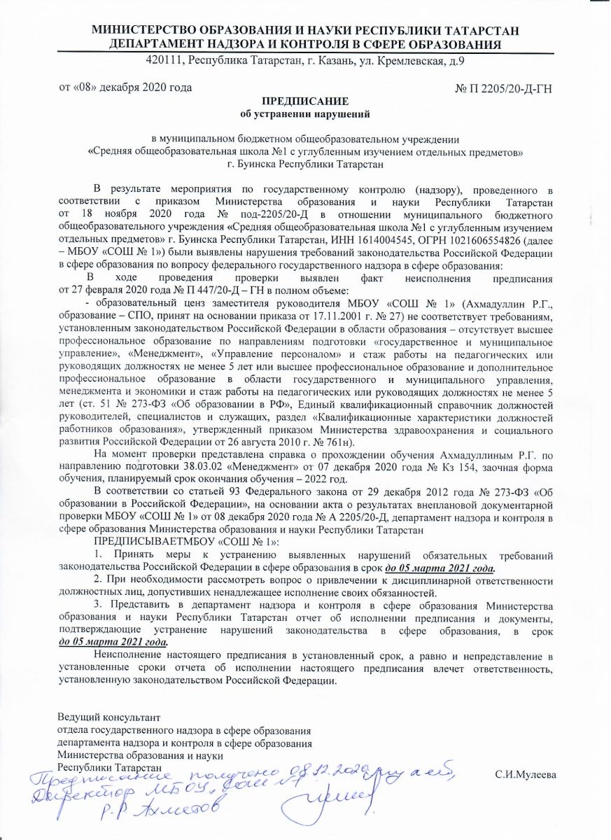 Предписание об устранении нарушений от 08.12.2020г. № П 2205/20- Д- ГН