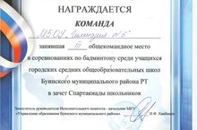 20 декабря состоялись соревнования среди учащихся городских общеобразовательных школ Буинского муниципального района по бадминтону в зачет Спартакиады. Команда гимназии в упорной борьбе заняла 3 место. Поздравляем команду гимназии и учителя физической культуры Кузьмина Александра Анатольевича с призовым местом!