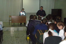В актовом зале школы представители МЧС провели беседу-практикум с учащимися 7-8 классов. Тема беседы: Правила поведения в осенне-зимний период, оказание первой помощи утопающему.