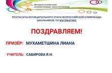 Ученица 8 класса Мухаметшина Лиана стала призёром муниципального этапа всероссийской олимпиады школьников по математике. Поздравляем! Молодец! (Учитель: Сабирова Я. Н.)