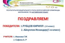 По итогам муниципального этапа Всероссийской олимпиады школьников по английскому языку ученик 10 класса Рубцов Кирилл, ученик 5 –в класса Айнуллов Искандер стали победителями. Молодцы! Желаем дальнейших успехов.