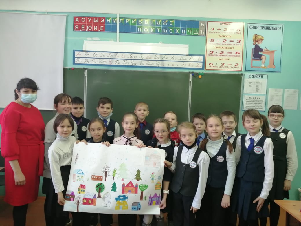 Коллективная работа «Зимний лес» совместно с психологом в 4 а классе.