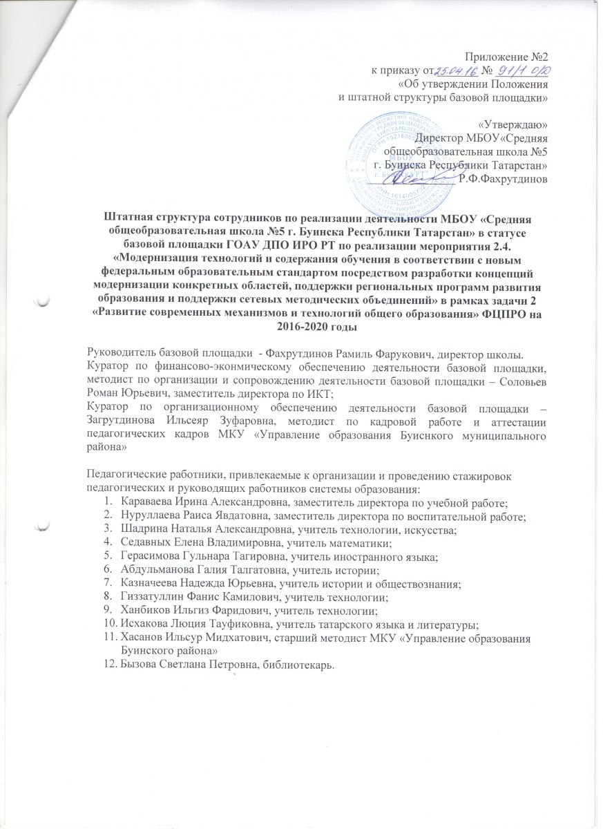 Штатная структура базовой площадки МБОУ "Средняя общеобразовательная школа №5 г. Буинска РТ"
