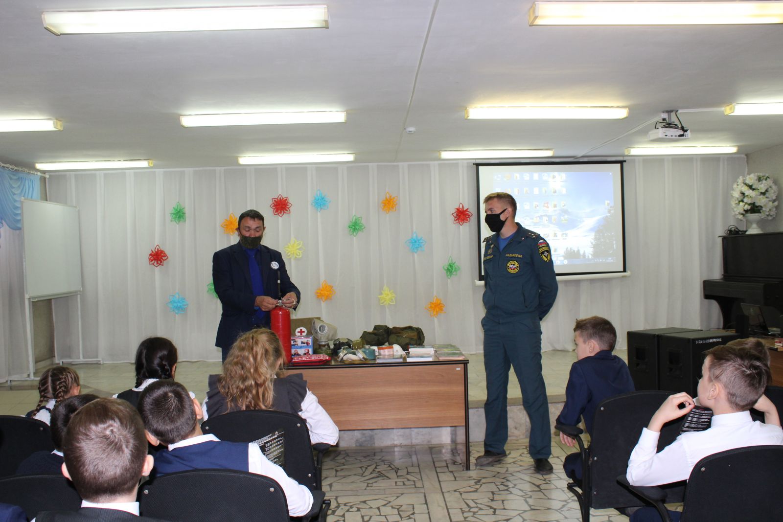 Учитель по ОБЖ Гиззатуллин Ф.К. показал средства защиты органов дыхания и пожаротушения. В конце урока посмотрели видеоролик на тему: «Как вести себя в пожароопасных случаях», потом для двух классов провели тренировку эвакуации из здании школы.