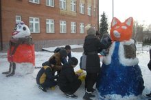 Первые снежные фигуры появились на территории нашей школы. В свободное от учебы время ученики слепили Лису, Снегурочку, Деда мороза, Обезьяну и покрасили их в яркие цвета. Ближе к Новому году сказочных фигур станет еще больше.