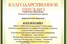Наша школа награждена Благодарственным письмом Управления образования Буинского муниципального района за подготовку и проведение II региональной научно – практической конференции “Шәҗәрәләр – нәсел агачы” .