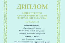 Поздравляем ученицу 8 класса Сабитову Эльмиру призера (2 место) республиканского конкурса юных исследователей окружающей среды. Руководитель, Юнусова Г.М.