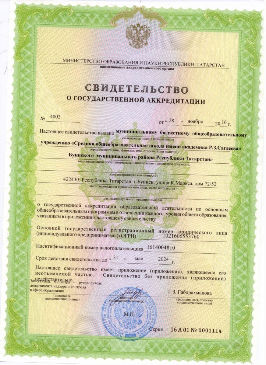 Муниципальное бюджетное общеобразовательное учреждение "Средняя общеобразовательная школа имени академика Р.З. Сагдеева" Буинского муниципального района Республики Татарстан/Татарстан Республикасы Буа муниципаль районы муниципаль бюджет гомуми белем бирү учреждениесе "Академик Р. З. Сәгъдиев исемендәге гомуми белем бирү мәктәбе"
