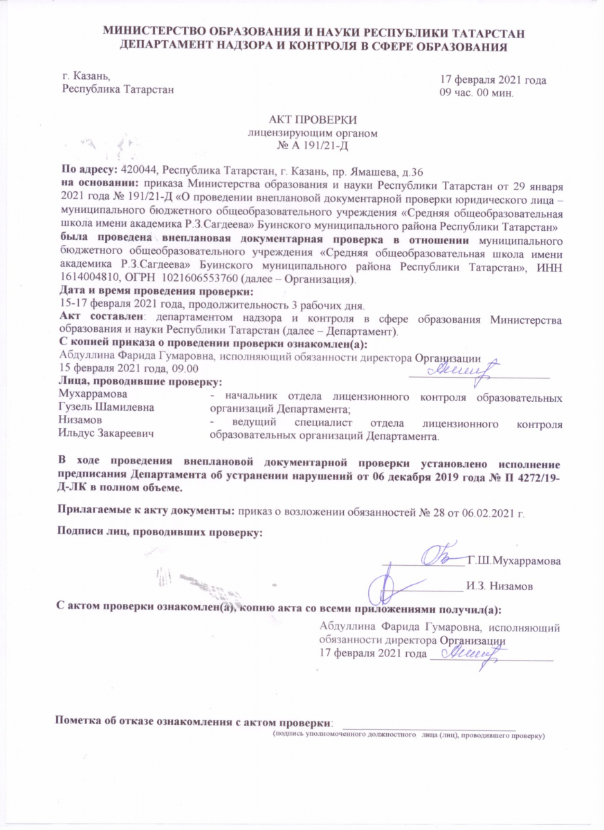 Акт проверки лицензирующим органом №А 191 /21 -Д