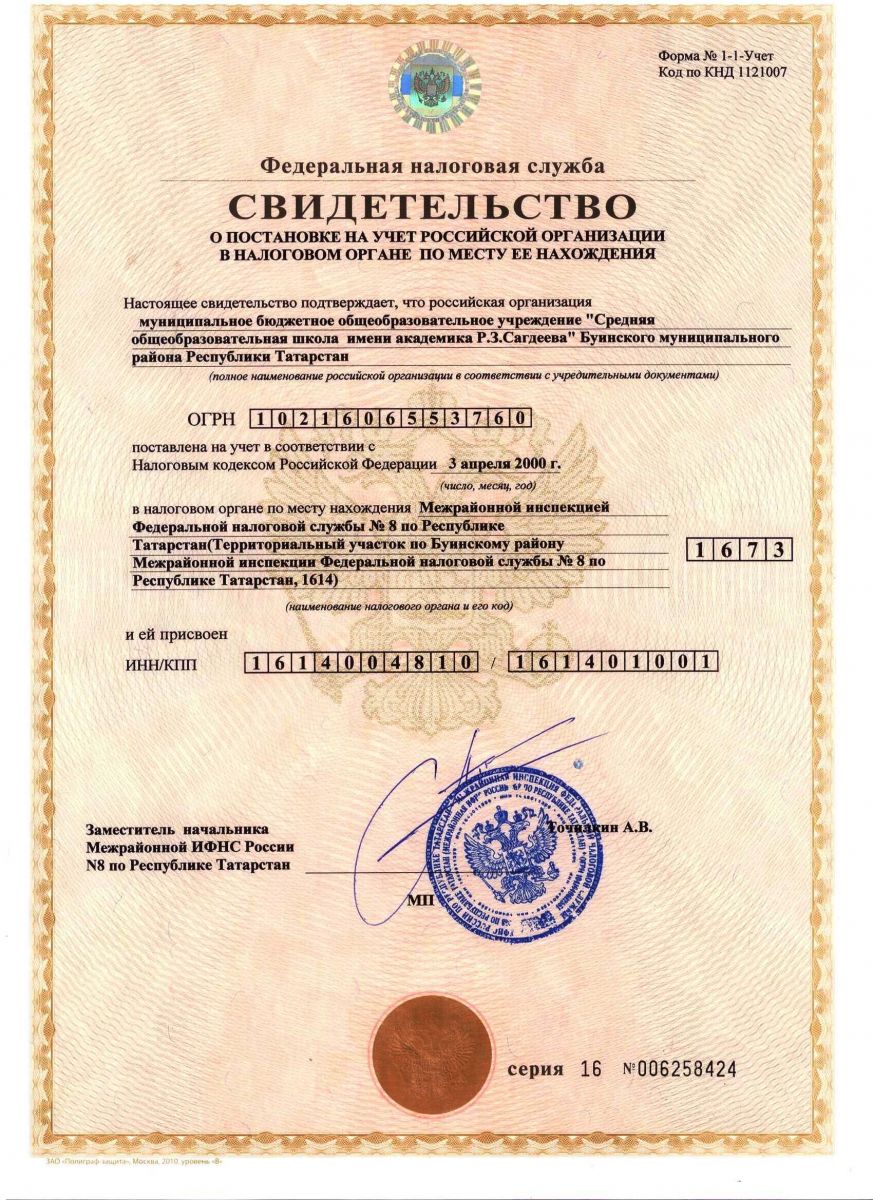 Свидетельство о постановке на учет российской организации в налоговом органе по месту ее нахождения