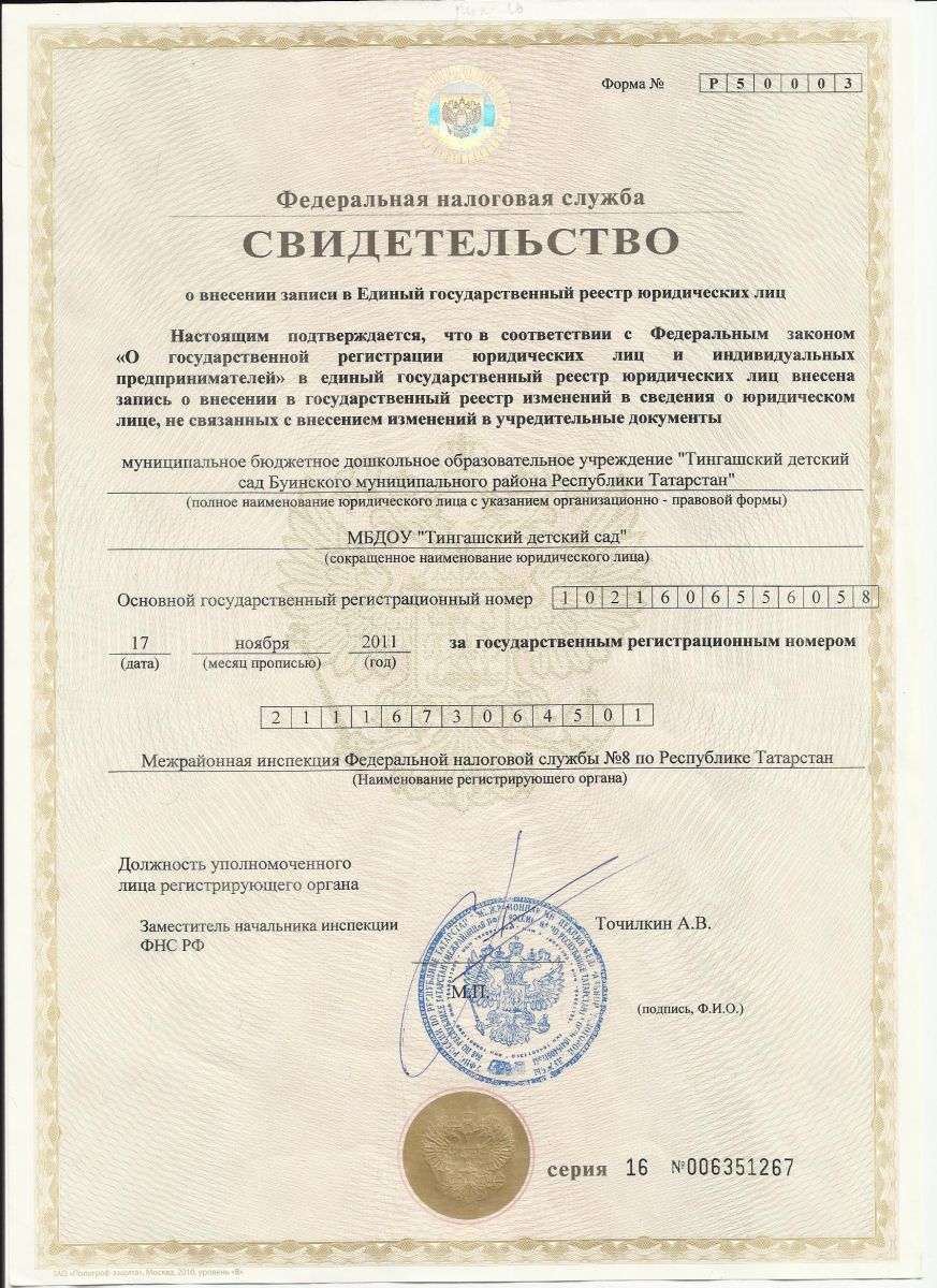 Лист изменений № 2 в устав МБДОУ"Тингашский детский сад Буинского муниципального района РТ"