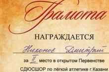 Поздравляем Никонова Дмитрия, ученика 8 класса, занявшего 2 место в открытом Первенстве СДЮСШОР по легкой атлетике г.Казани в беге на 800 метров.Администрация школы выражает благодарность учителю физкультуры Карамаликову И.И., за подготовку призера республиканских соревнований. Молодцы!!!
