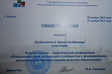 В Казани 20 -21 ноября прошла вторая научно – практическая конференция «Повышение роли экспертного сообщества в формировании региональной системы оценки качества образования». На этой конференции участвовала учительница русского языка и литературы Евдокимова И.А.