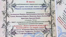 Поздравляем Калмыкову М., Красильникова Д., Еферова С., Макарова К., Моисееву Д., Калмыкову К., Краснова В. со II местом на республиканском конкурсе «Культурное наследие моего народа» в номинации «Живи и процветай, родной язык!» (руководители: Иляшкина И.В., Еферова Л.А., Трофимова Л.М., Мензелина А.Г.) Молодцы.