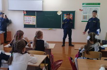 Урок безопасности 03.09.2018 В рамках месячника безопасности сотрудники МЧС с учениками начальных классов провели беседу на пожарную тематику