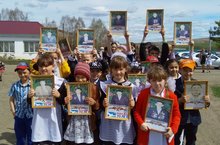 "Үлемсез полк" акциясе кысаларында мәктәп укучылары кулларына Бөек Ватан сугышы геройларының портретларын һәм чәчәкләр тотып Ленин урамы буйлап атладылар.