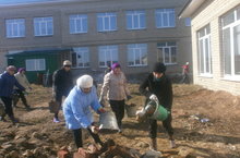Мәктәп укытучылары мәктәп тирәсен чистартырга өмәгә чыктылар. Алар җиң сызганып бар җирне тәртипкә салдылар, кар астыннан чыккан чүпләрне җыйдылар.