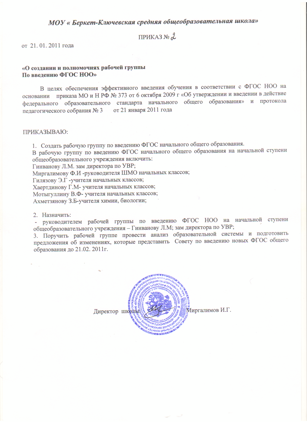 ⇒ Приказ о создании и полномочиях рабочей группы по введению ФГОС НОО