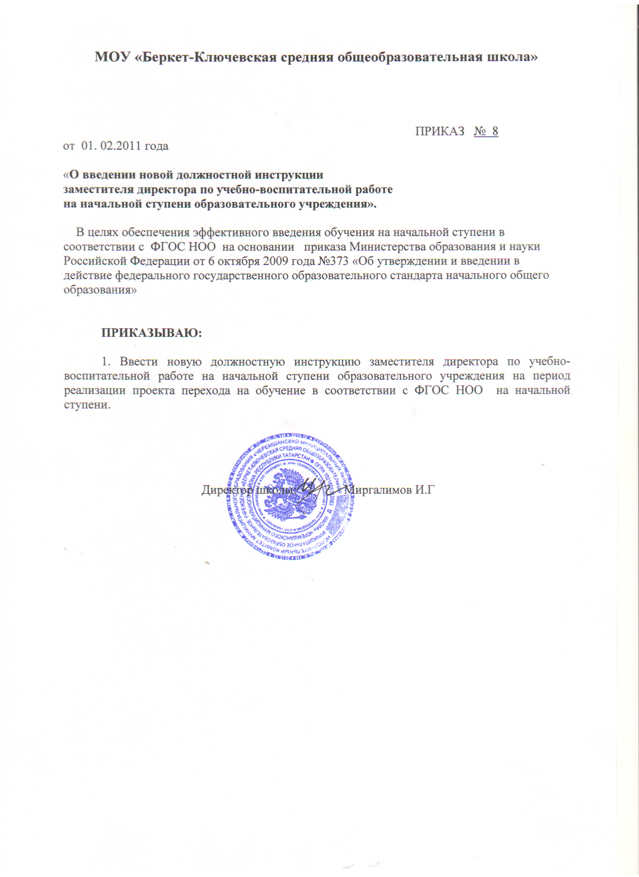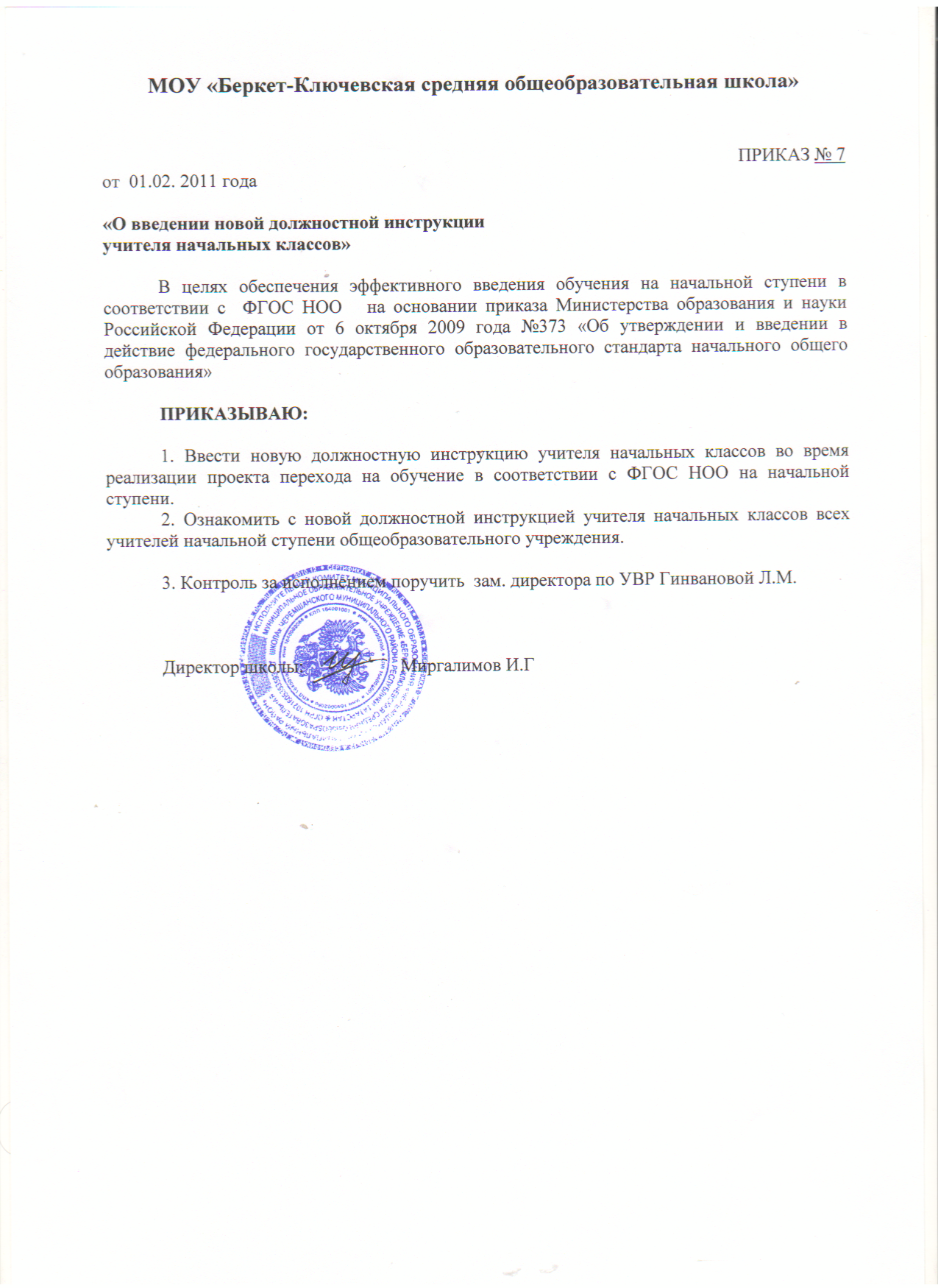 ⇒ Приказ о введении новой должностной инструкции учителя начальных классов