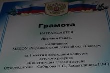 "Конституция балалар күзлегеннән" балалар рәсемнәре конкурсы нәтиҗәләре буенча безнең тәрбияләнүче Яруллин Раил җиңүче Грамотасына лаек булды.