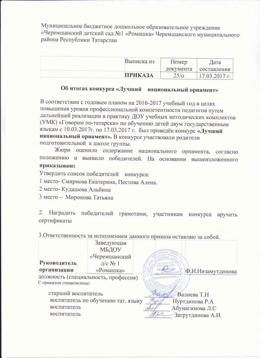 Опубликовано: 17.03.2017Приказ об итогах конкурса "Лучший национальный орнамент"