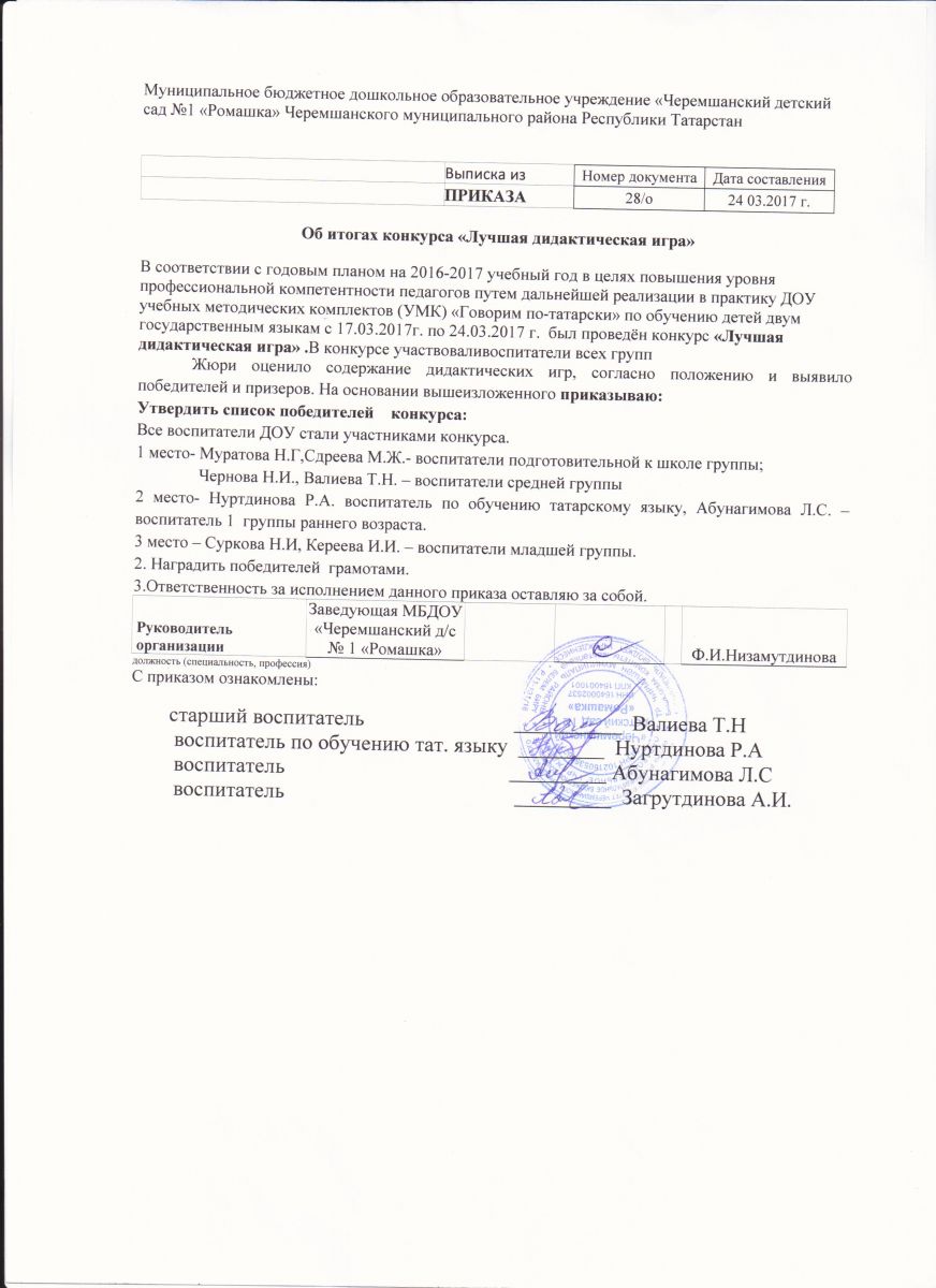 Опубликовано: 24.03.2017Приказ об итогах конкурса "Лучшая дидактическая игра"