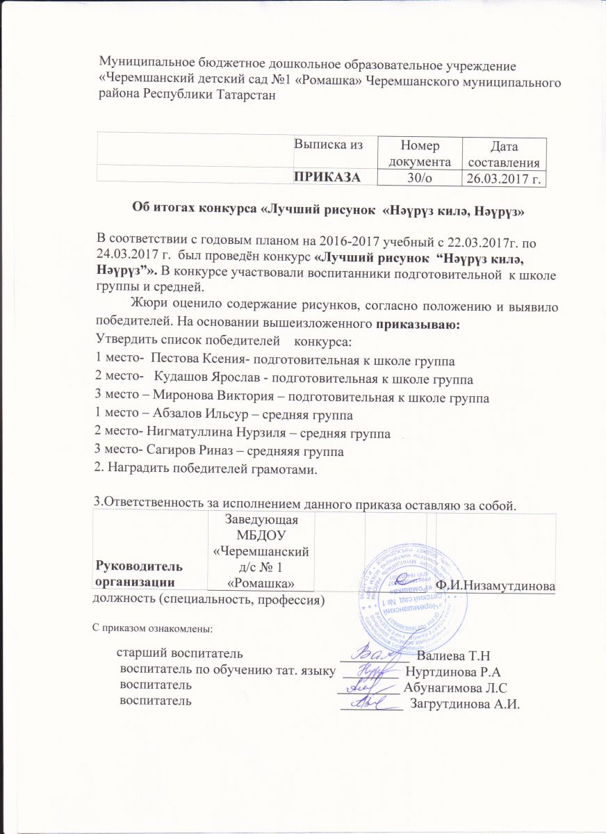 Опубликовано: 24.03.2017Приказ об итогах конкурса "Лучший рисунок "Нәүрүз килә, Нәүрүз"