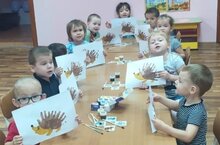 На занятии кружка дети познакомились со стихотворением С. Маршака "Ежик". Затем свои фантазии с ладошками изобразили на листе бумаги. -