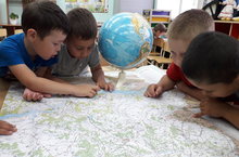 Эта неделя посвящена путешествию. В первый же день дети познакомились с помощниками в путешествии: глобусом и картой. Они поняли, что глобус это модель земного шара, а карта это плоское изображение участка поверхности земли. Дети увидели на карте реки, моря, океаны и многое другое.