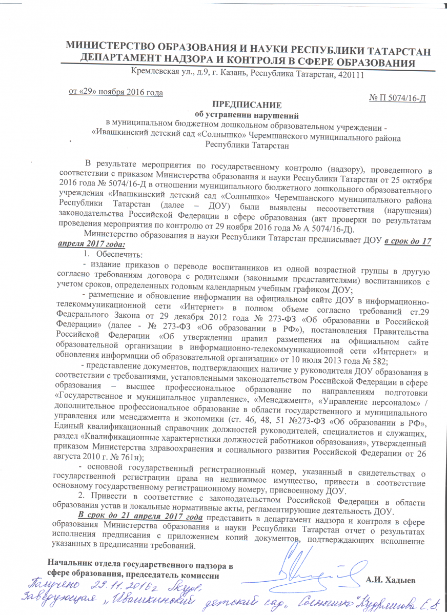 Предписание по Департаменту надзора и контроля в сфере образования МО и Науки РТ " Об устранении нарушений в МБДОУ "Ивашкинский детский сад "Солнышко"Черемшанского муниципального района РТ