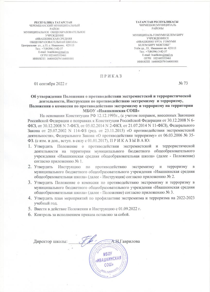 Приказ об утверждении Положения и плана по профилактике терроризма и экстремистской деятельности