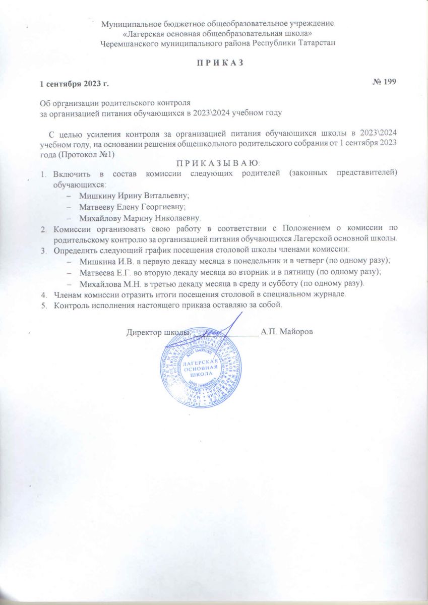 Положение о комиссии по родительскому контролю за организацией питания обучающихся Лагерской ООШ